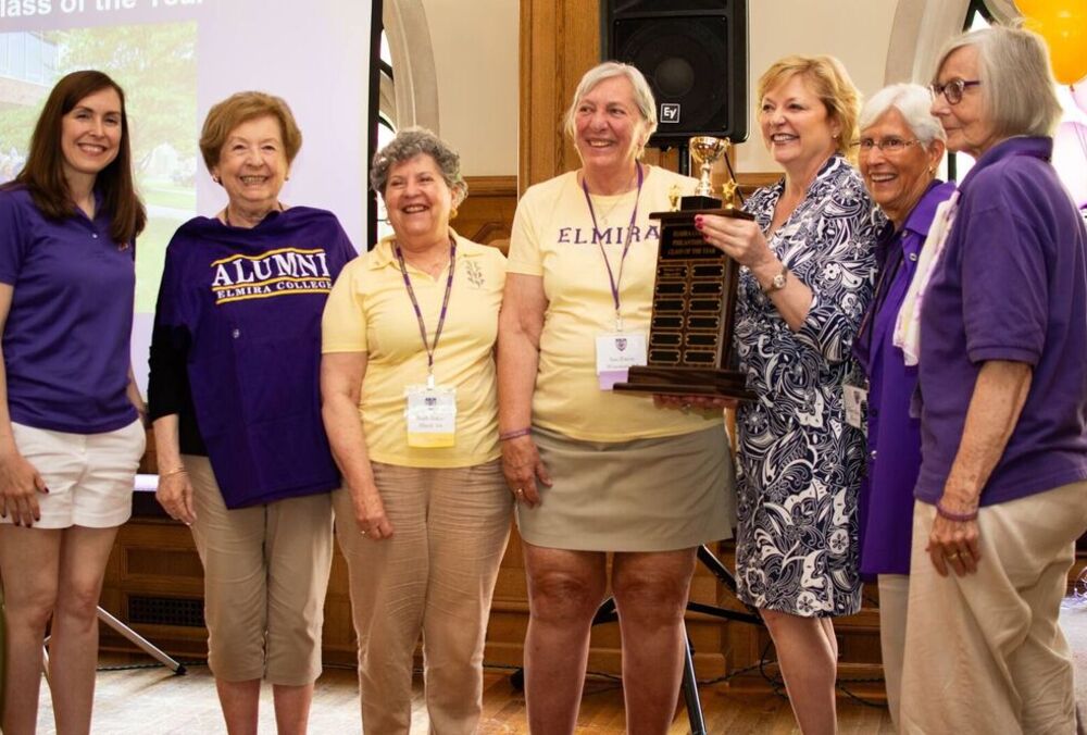 This award is given to the reunioning class that shows the most school spirit, which can be demonstrated in several ways: the loudest, most versed in school song, the most prepared in class theme (the theme can be ELMIRA COLLEGE!), etc. The award will be announced by President Lindsay at the Annual Meeting with the President. This award will be presented at each Reunion and will be on display on Campus throughout the year.